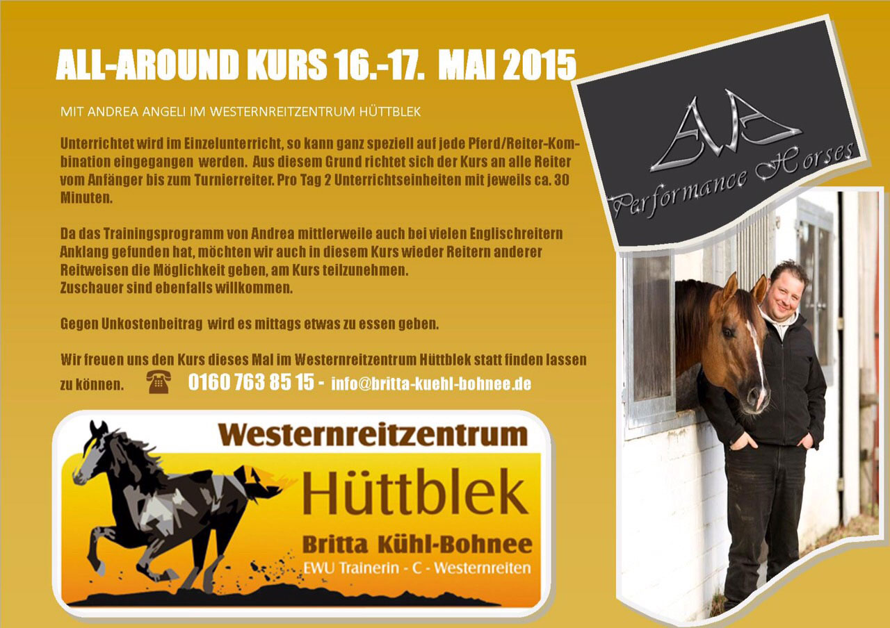 Britta. Der Kurs beinhaltet: Training und Gymnastizierung des Trail-Pferdes, Korrektes Bewältigen der Trail-Hindernisse, Tor, Rückwärts- und Seitwärtshindernisse, überwinden von Bodenstangen in allen Gangarten. EWU-Mitglieder erhalten eine Ermäßigung von 10%. Hier die Ausschreibung 22.05.2013 Am 24./25.08.2013 findet im Westernreitzentrum Hüttblek ein Kurs "Gymnastizierung, Durchlässigkeit, Balance" statt. Kursleiterin ist